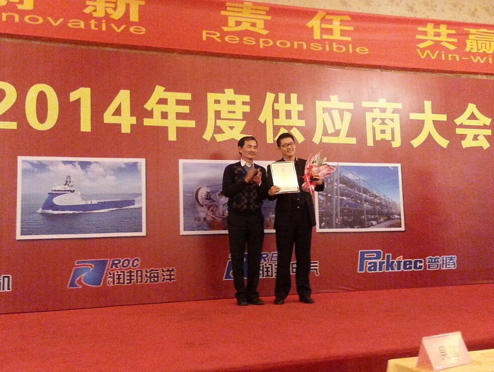 新年伊始,南通潤邦海洋工程裝備有限公司2014年度供應商大會在江蘇南通隆重舉行,來自全國各地的150家供應商二百余名代表, 潤邦股份董事長、總裁及相關負責人參加了此次盛會。在當晚最受矚目的2014年度優(yōu)秀供應商頒獎環(huán)節(jié),利星行機械(上海)有限公司不負眾望地獲得了南通潤邦海洋工程裝備有限公司“2014年度優(yōu)秀供應商”榮譽稱號,利星行船舶動力部銷售總經(jīng)理洪波先生代表公司接受了這份榮譽并對進一步加強雙方合作和共同捕捉商業(yè)機會進行了展望。
