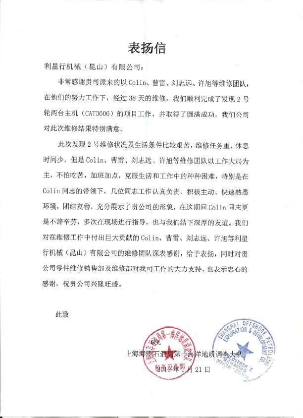 這是一封來自上海海洋石油局的感謝信,他們對利星行機械維修團隊給予了高度評價,通過向客戶提供優質服務,公司也展現出積極主動、團結合作的良好形象,在客戶的肯定聲中獲得雙贏。
