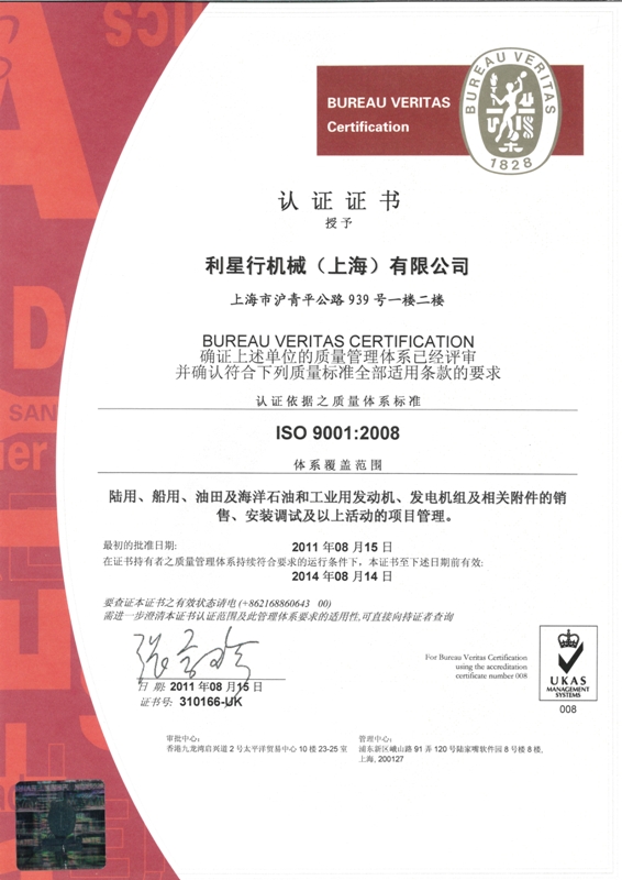 利星行機(jī)械獲得ISO9001:2008認(rèn)證的產(chǎn)品包括:陸用,船用,油田及海洋石油和工業(yè)用發(fā)動(dòng)機(jī),發(fā)電機(jī)組及相關(guān)附件的銷(xiāo)售,安裝調(diào)試及以上活動(dòng)的項(xiàng)目管理。